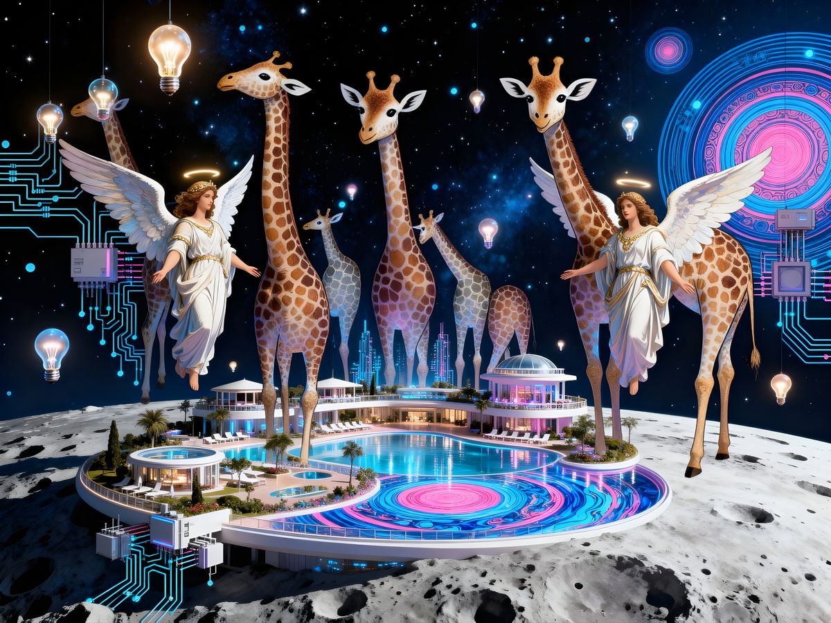 A hyper-realistic, insanely detailed cosmic resort on the moon with giraffe angels, featuring floating lightbulbs and circuits. Rendered with advanced lighting and reflections for an elegant, ornate aesthetic.