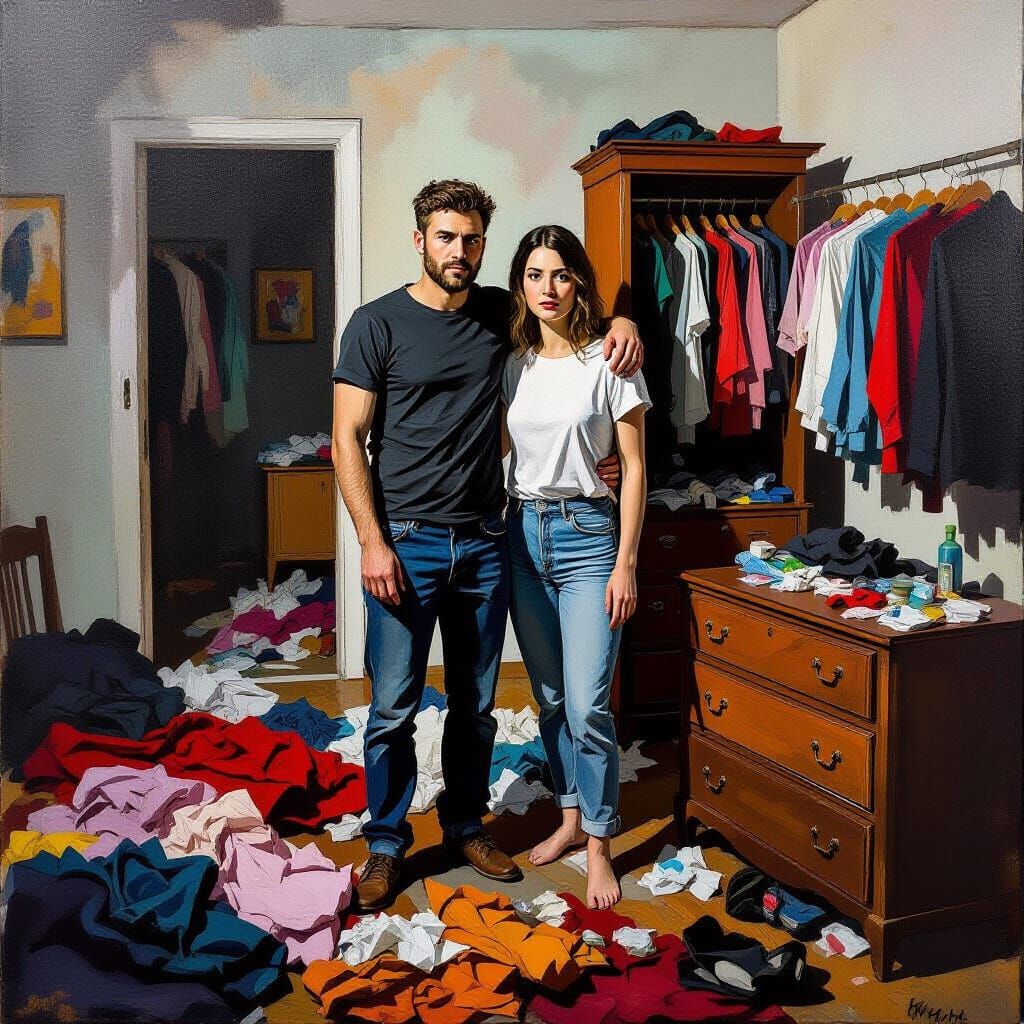 A group of people are standing in a messy room with clothes strewn everywhere. The image evokes a sense of disorder and emotional intensity, depicted with expressive colors and chaotic composition.