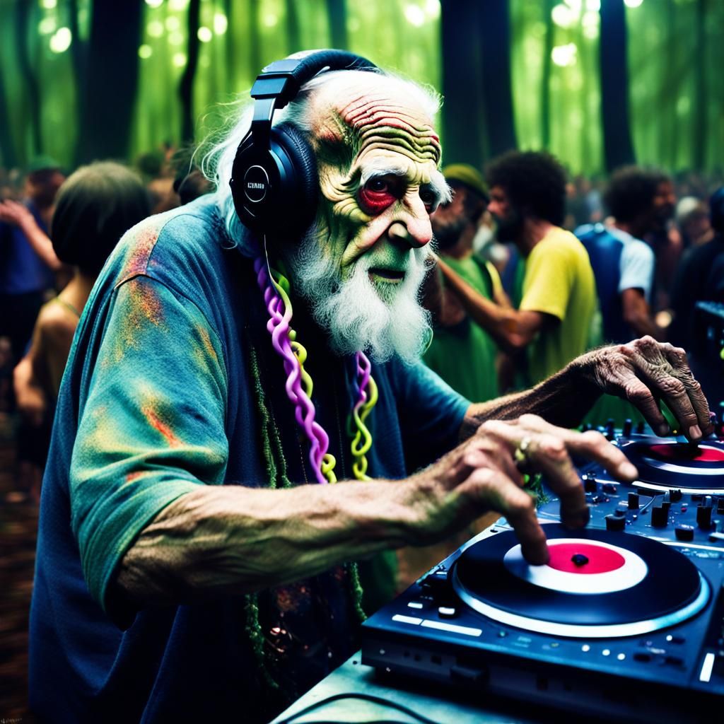 a high quality professional photograph of a very old man with tentacles on his face DJing at a big rave in the forest full of demonic hippies, photorealism, realistic, diane arbus, brooke shaden, 3D, texture, textured, realism, professional photography, natural lighting, highly detailed, fine detail