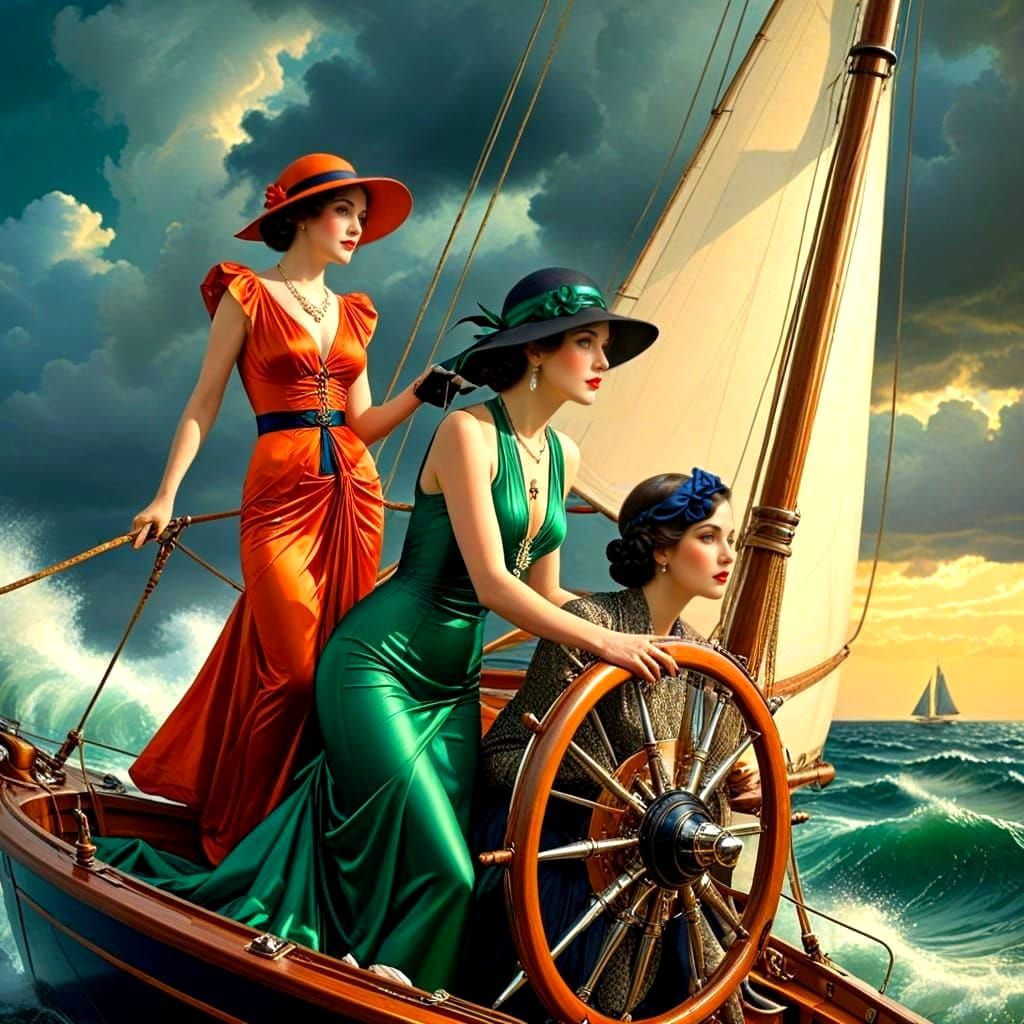 gorgeous glamorous confident mature 1920s ladies in classy elegant extravagant 1920s outfits holding the helm steering a sailboat through stormy emerald-colored sea, stylized photorealism, art deco, surrealism by Gustav Klimt, Max Ernst, Tamara de Lempicka, Catherine Abel, Georges Lepape, Brad Kunkle, ...