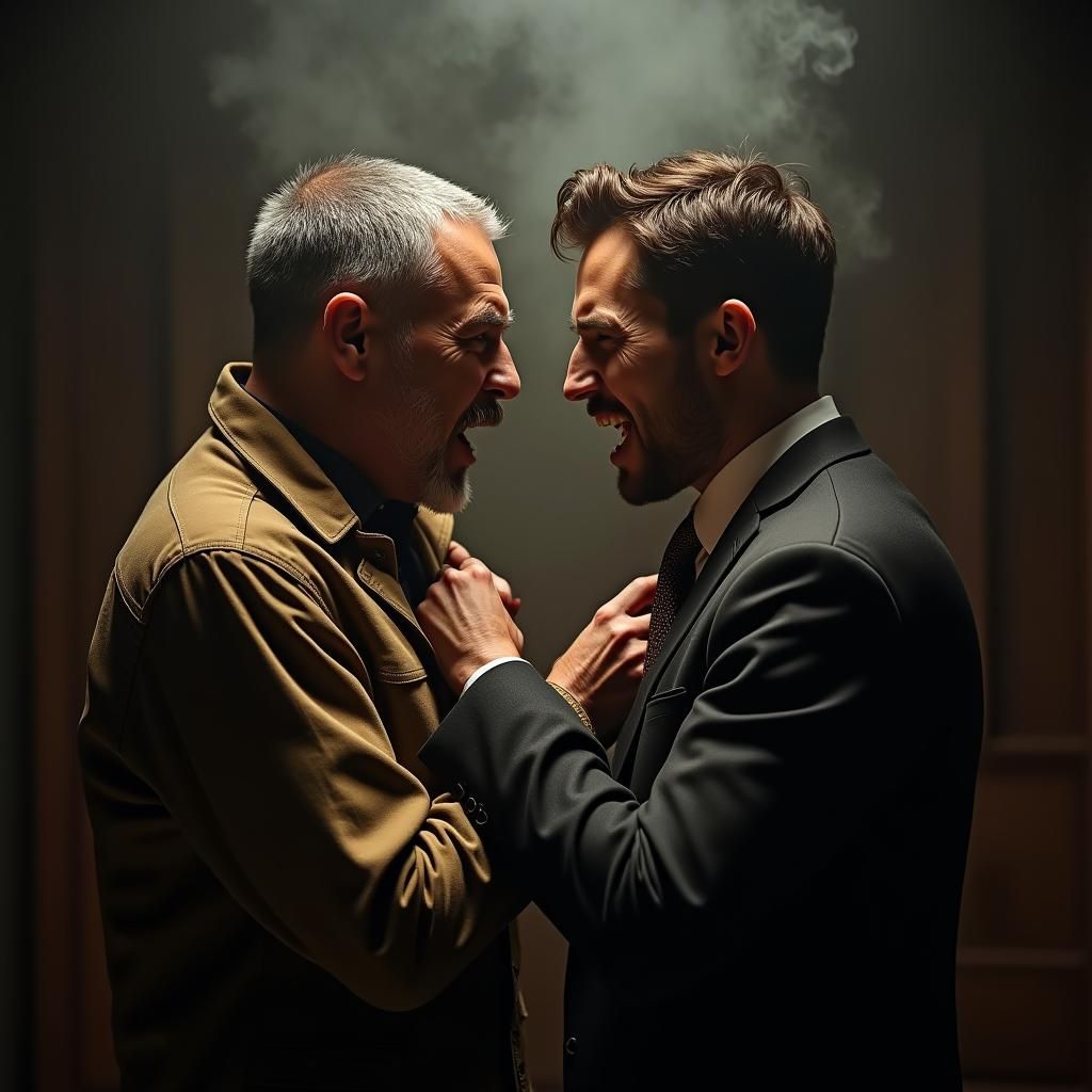 This image shows two men in a tense confrontation in a smoky, dimly lit room. The hyperrealistic image employs high contrast, warm colors, and shallow depth of field to emphasize their emotional intensity.
