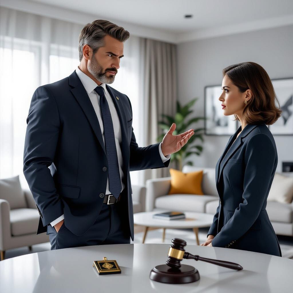 This image shows a man in a suit sternly warning a woman. A badge and gavel rest on a nearby table, rendered in a dark, noir-inspired aesthetic reminiscent of digital concept art.