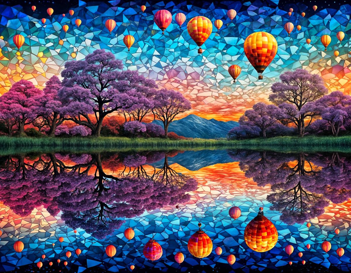 A surreal picture of a sunset over a dreamy lake filled with floating balloons. This mixed media artwork features high contrast, iridescent colors, and kaleidoscopic mosaic details.