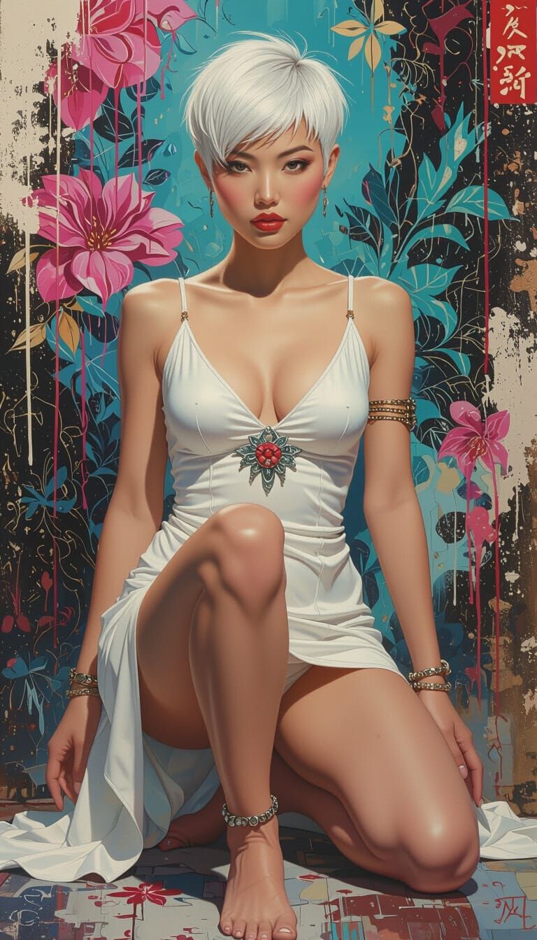 This image shows an East Asian woman with short white hair wearing a short white dress with floral patterns. The fantasy illustration features a dreamy atmosphere and colorful, high-contrast polychromatic elements.