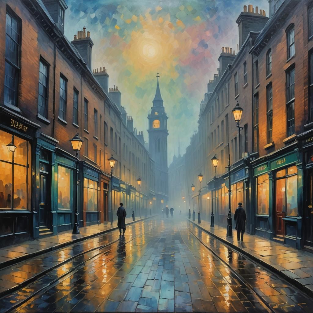 A foggy London street scene evokes Victorian era vibes. The neo-impressionistic painting features thick layers of colorful textured paint, with smooth post-impressionist impasto acrylic techniques.