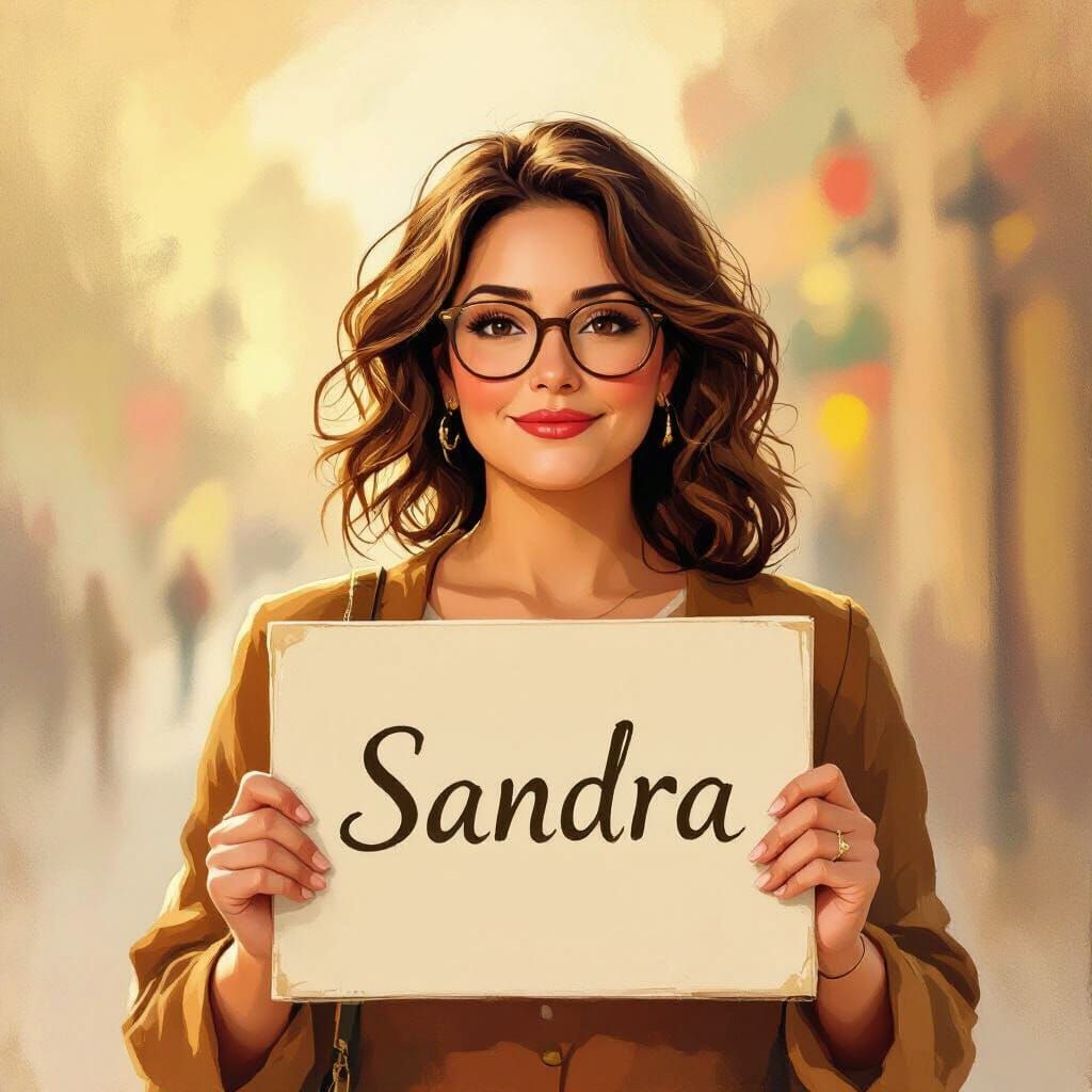 This image shows a 40-year-old woman with cinnamon skin, glasses, and wavy brown hair, holding a sign that reads "SANDRA." The portrait is in a soft, painterly Impressionist style with warm golden hour lighting.