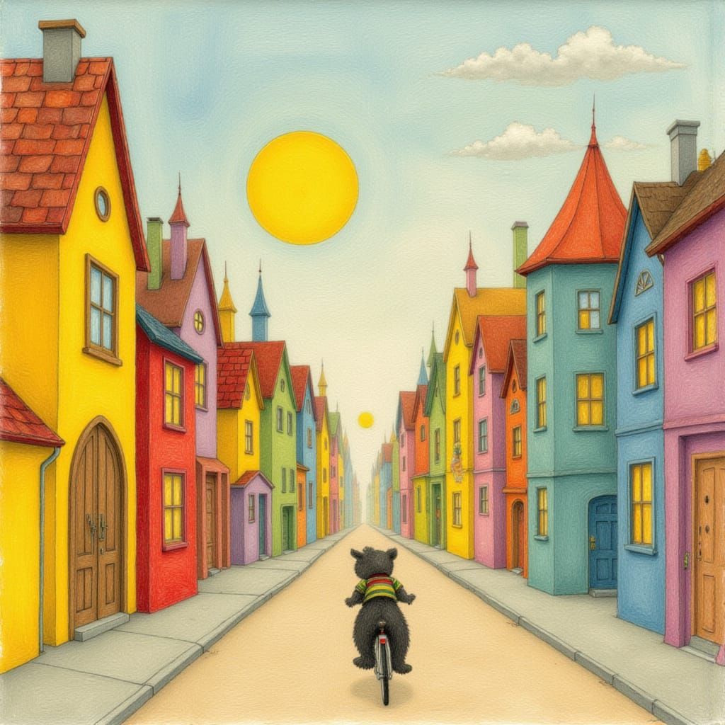 This image depicts a charming, cubist-style illustration of a vibrant street with uniquely sized buildings and a bear humorously cycling backward. Features soft, storybook colors.