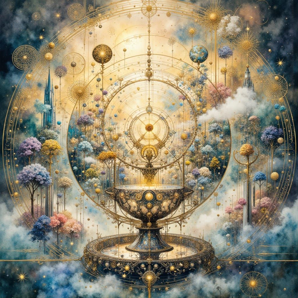 This image displays a stylized digital watercolor of an orrery. It features complex double exposure, magic, and disintegration elements, with soft cinematic lighting and pastel colors. Rendered with HDR and sharp yet soft details.