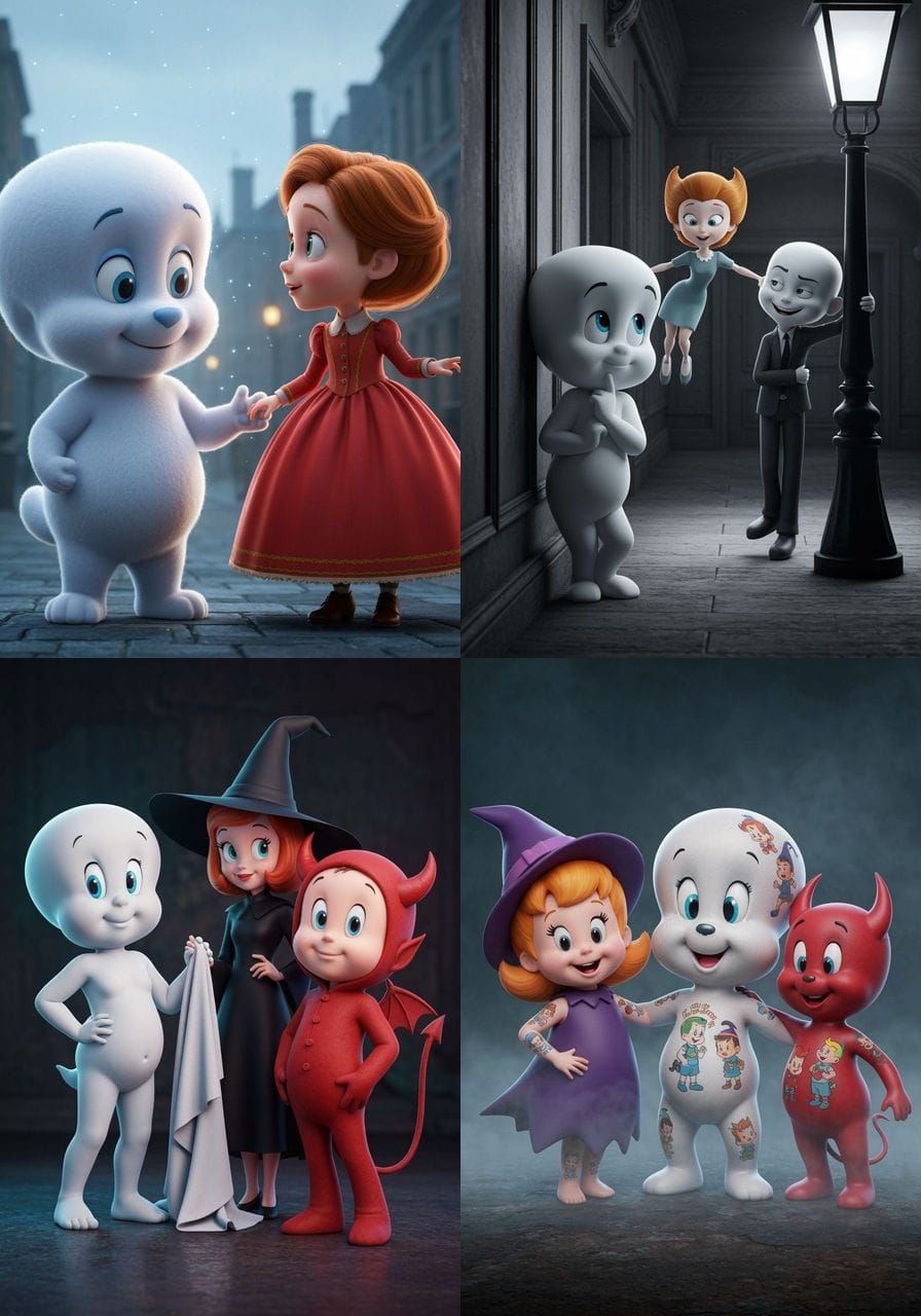 This image shows a tattoo flash sheet featuring classic cartoon characters. Casper the Friendly Ghost, Wendy the Good Little Witch, and Hot Stuff the Little Devil are rendered in a photorealistic style.