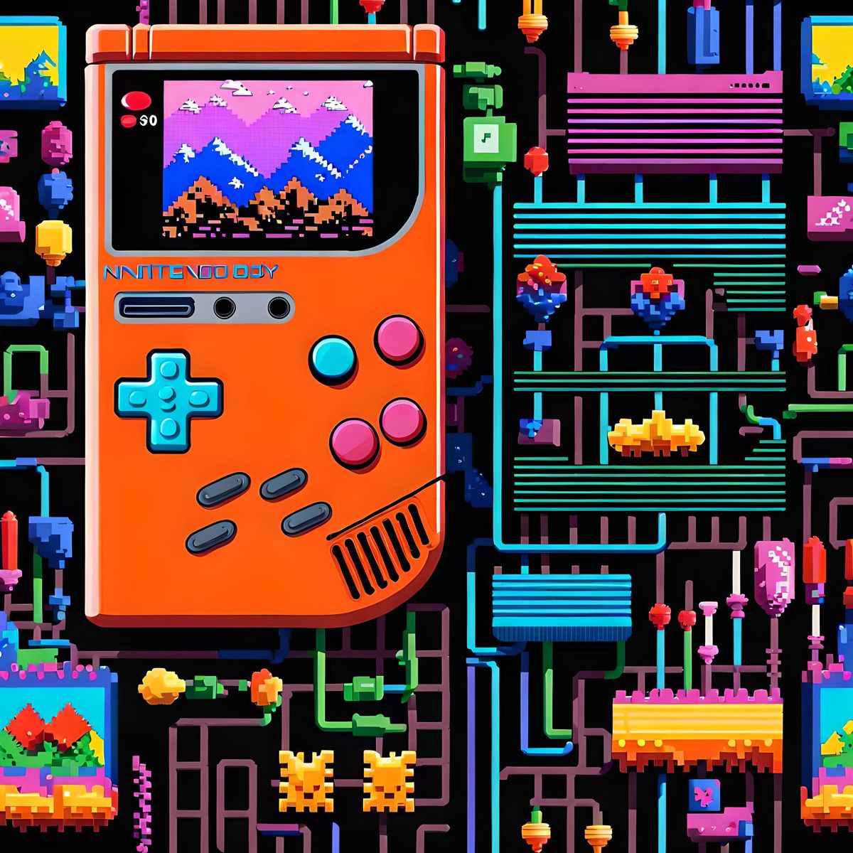 This image shows a hyperdetailed, 8-bit pixel art close-up of a vintage 1989 Nintendo Game Boy. The background features neon colors and bold 80s-style patterns.