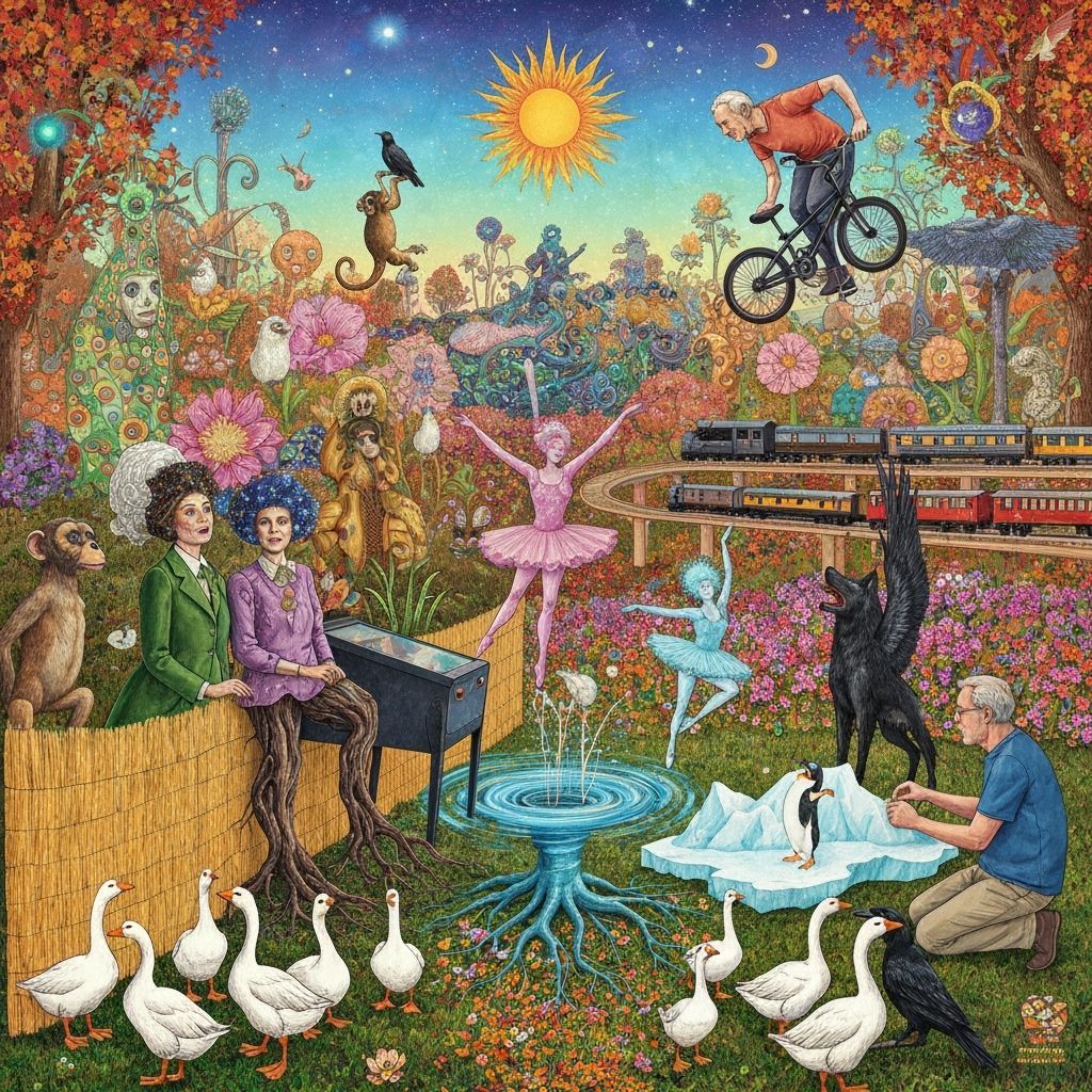 This image depicts a folkloric robot with stardust hair, posing with her twins in a surreal, eco-art garden. The scene features bioluminescent plants and cosmic energy, rendered in a vibrant, psychedelic style.