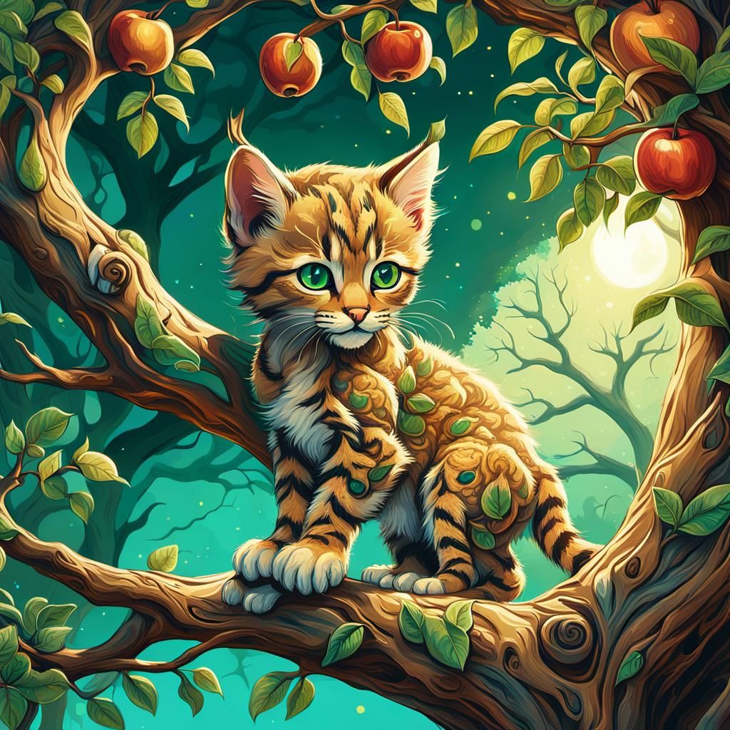 A vibrant image of a bobcat kitten climbing in an old apple tree. Illustrated with rich colors, intricate patterns, and textured foliage under a leafy canopy, in a whimsical fantasy art style.