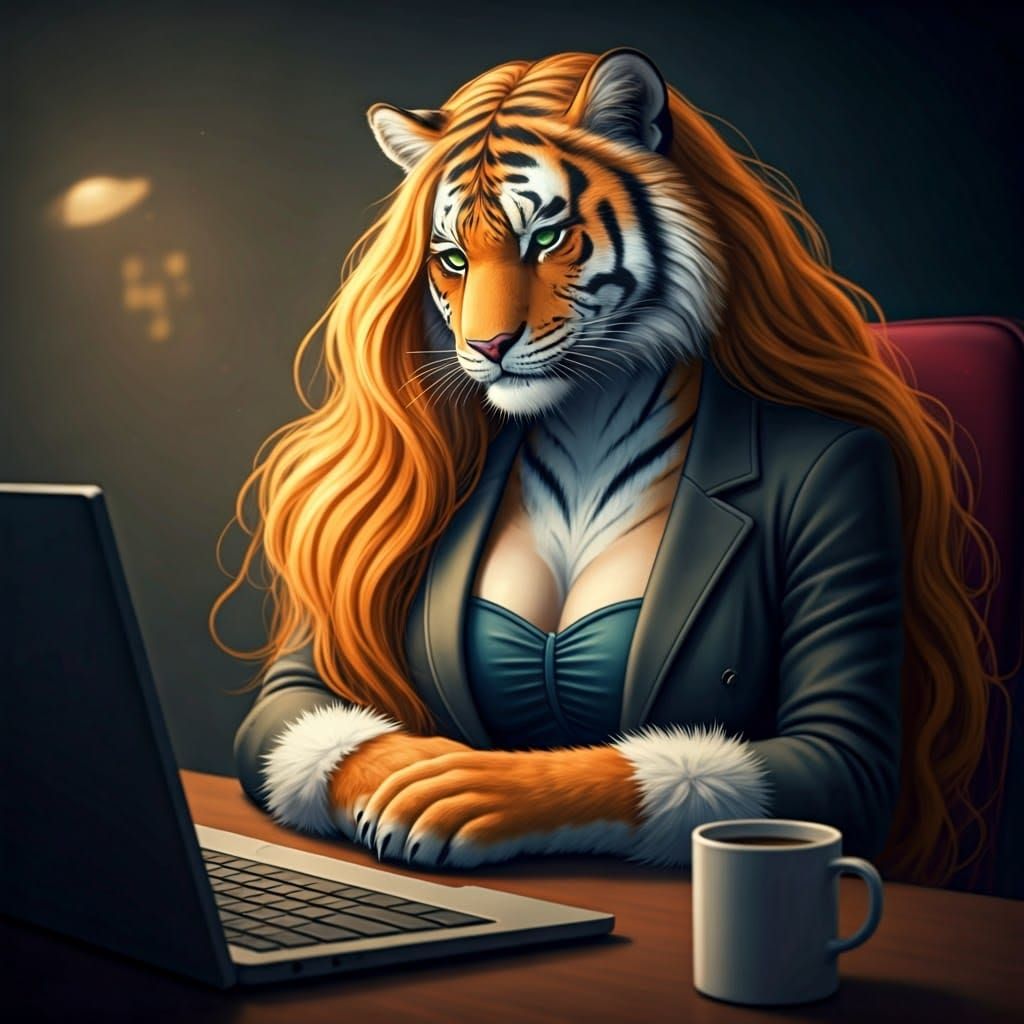 A beautiful, anthropomorphic tigress struggles to stay awake at her desk, her professional attire and surroundings hinting at a rough morning after a wild weekend, as she reaches for a steaming coffee mug to start her day.