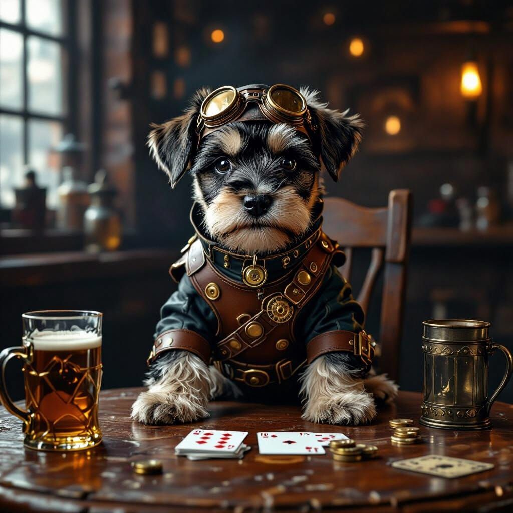 A miniature schnauzer in a steampunk aviator outfit sits at a wooden table in a smoky tavern. The image features detailed fantasy realism and a painterly illustration style.