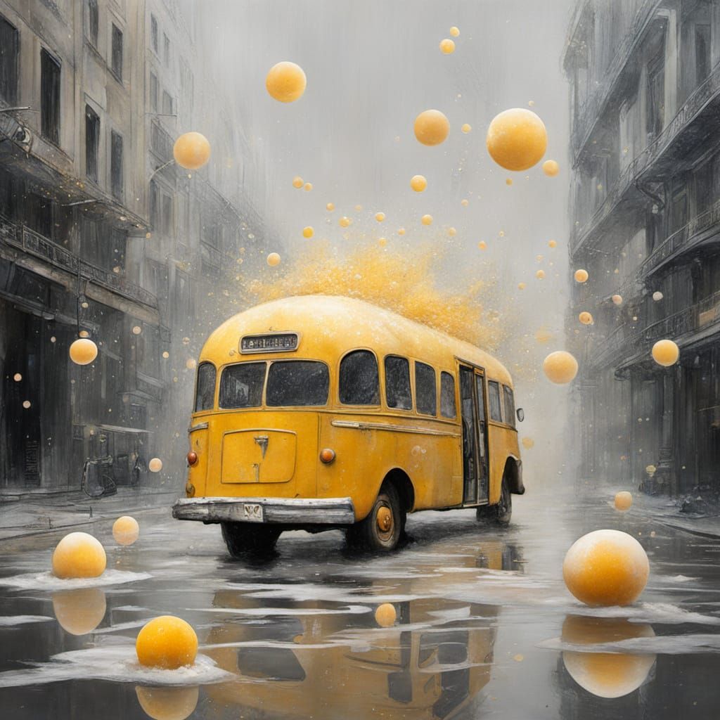 This surreal painting features a peach-colored kangaroo with a crowshead, set against a backdrop of abstract elements and a yellow school bus. It has a wet wash and light dust effect, evoking a cyberpunk aesthetic.