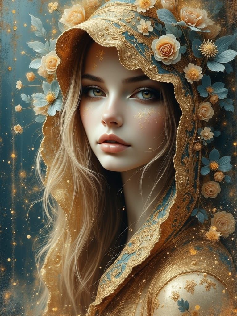 A silent elegance cloaked in gold and floral whispers — where softness meets majesty in every gaze. – AlShahriF