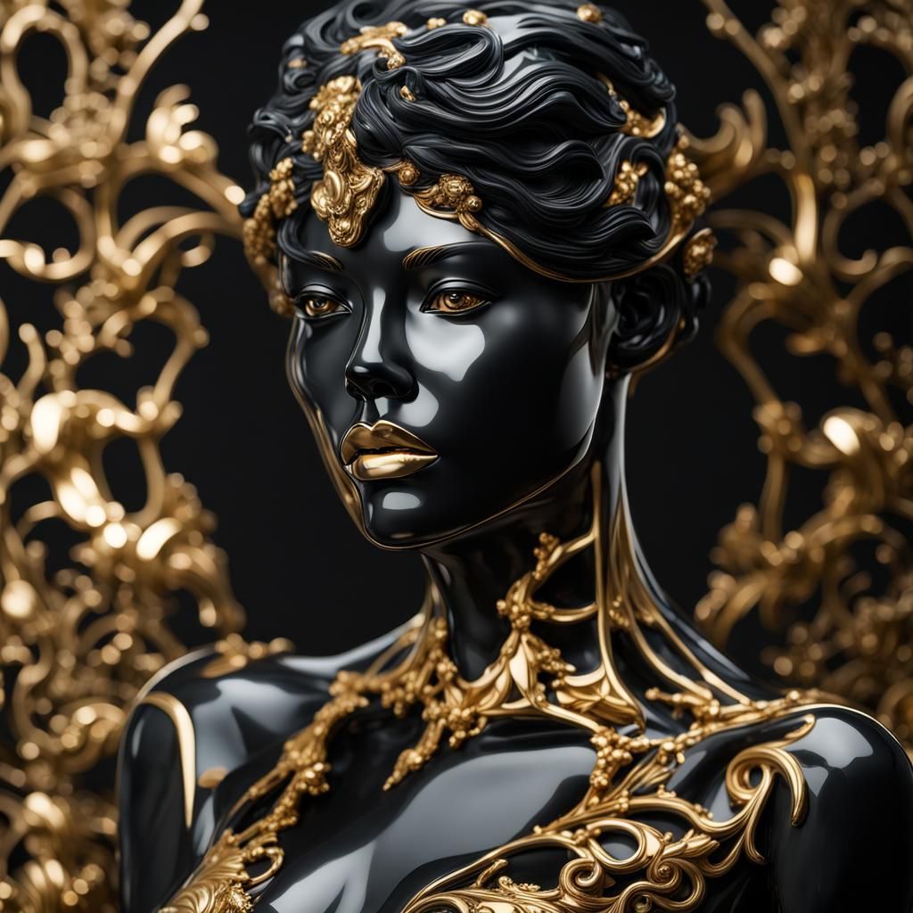 This image shows a striking sculpture of a woman. The artwork is rendered in a hyperrealistic style, featuring obsidian glass, gold accents, intricate details, and a moody atmosphere.