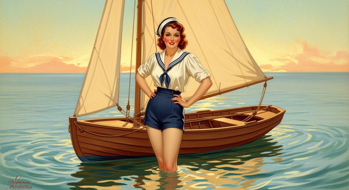 This image shows a vintage pin-up woman in a sailor outfit beside a wooden dinghy on an azure sea at sunset. The artwork features soft brushstrokes and a delicate texture, evoking old Hollywood glamour.