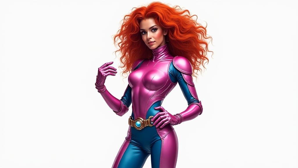 A striking picture of a space woman with red hair and metallic armor. The high-contrast acrylic painting features intricate details and a crisp white background, reminiscent of concept art.