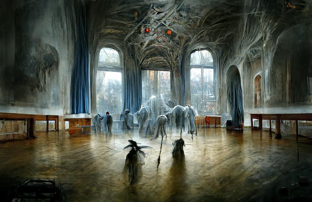 A creepy and unsettling image of a ghostly dance within an elegant castle hall. The scene evokes horror and is rendered with hyperrealism reminiscent of dark surrealist art.