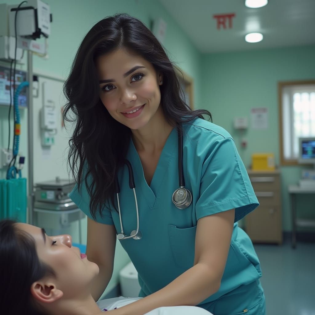 This image shows Maria Bradley, a 30-year-old Latina nurse with wavy black hair, tending to a patient in a busy emergency room setting. The hyperrealistic image is rich in texture and detail.