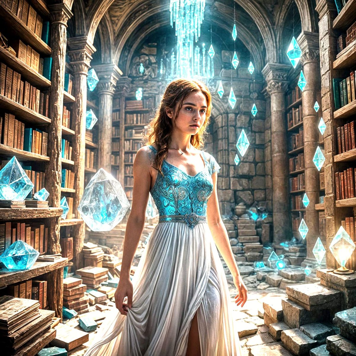 This image shows a girl trapped in a crystal, channeling power in a stone room. The scene is illuminated by electric-blue light, creating high-contrast shadows and a chaotic display of light.