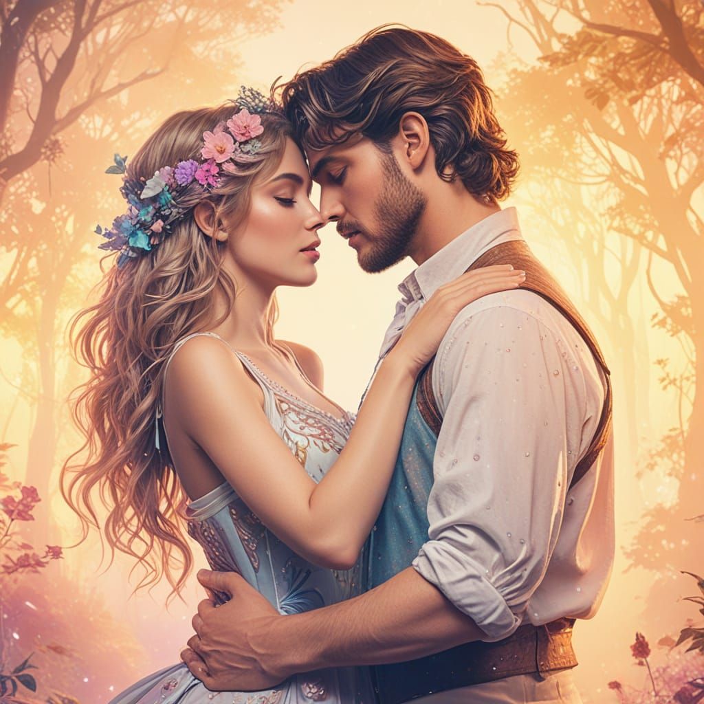 This image shows a beautiful young couple in a mystical forest setting. The portrait is rendered with vibrant colors and dynamic lighting, creating a dreamy, ethereal atmosphere, as a digital painting.