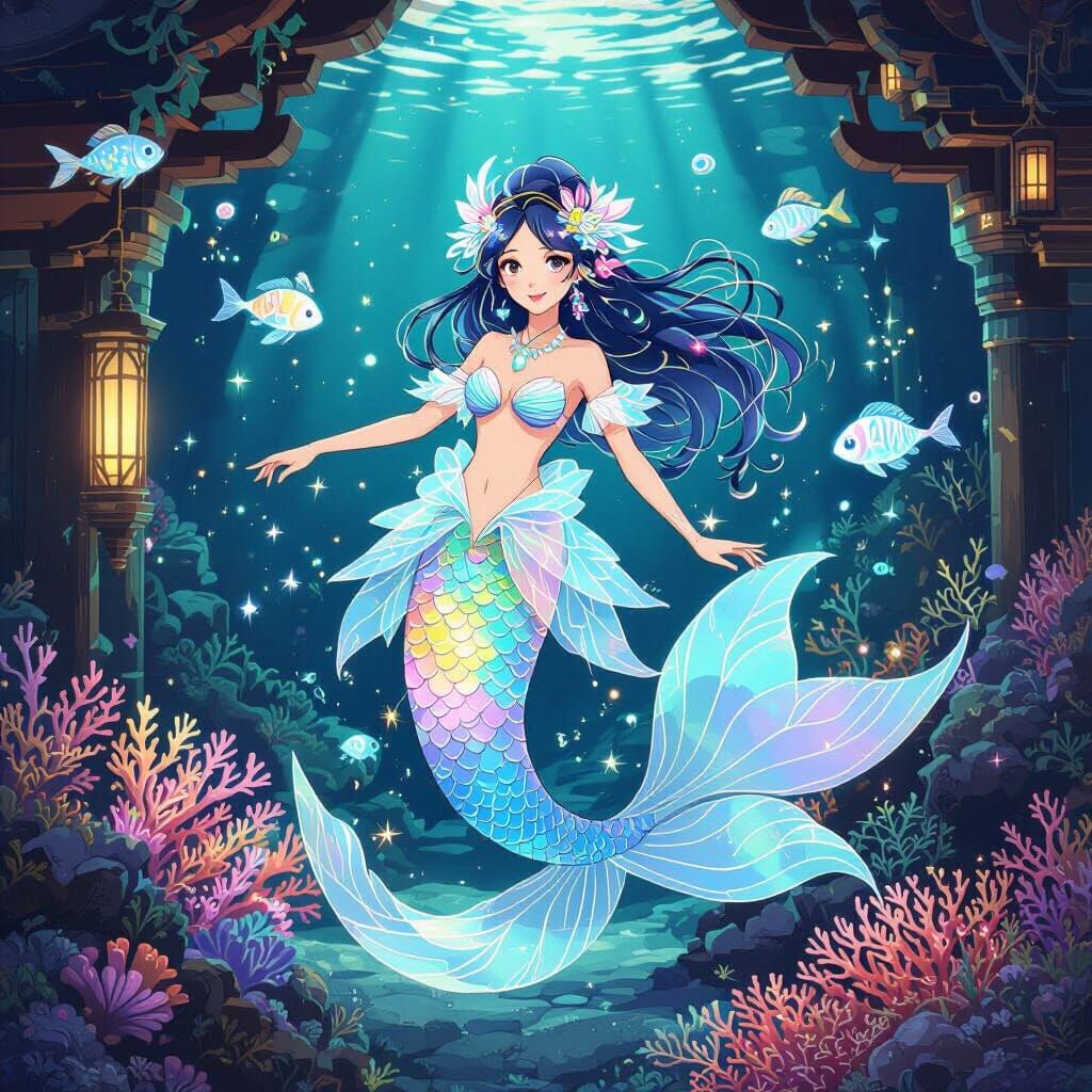 This image shows a mermaid with holographic scales dancing among glowing coral reefs. The Ghibli-style artwork features bioluminescent sea creatures and spirit-like AI constructs in an underwater shrine.