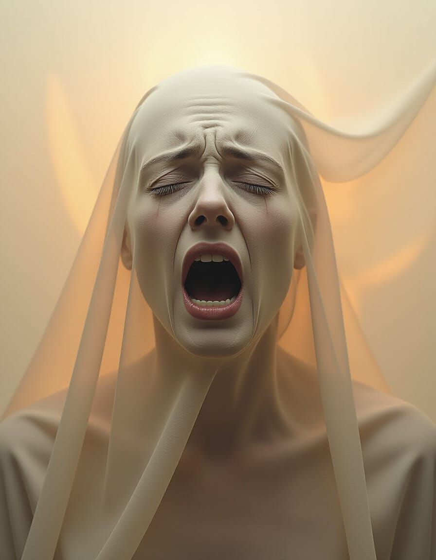 This image shows a screaming face shrouded in a translucent sheet. The blurred and indistinct features are reminiscent of dark surrealist art, with warm light and muted colors.