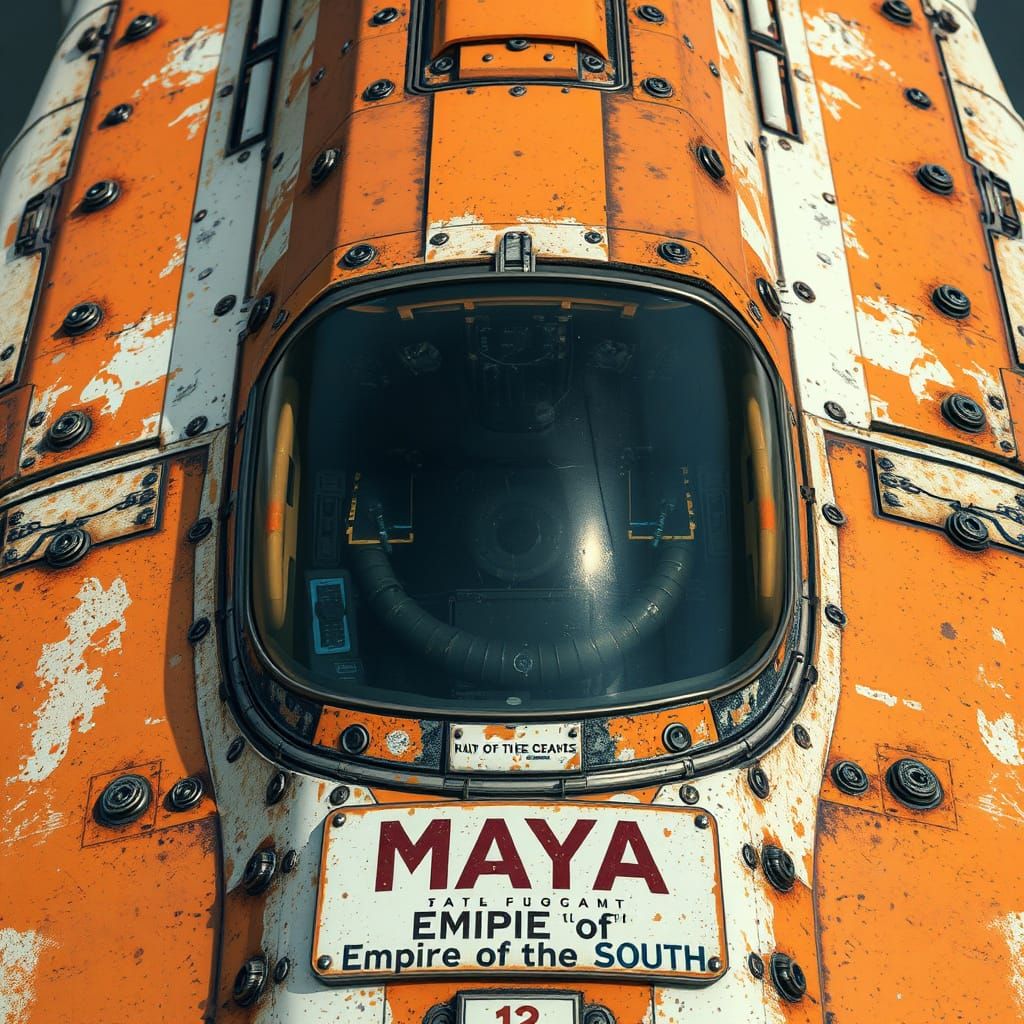 This image shows a worn, vintage-style spaceship featuring a glass and black steel cockpit. The bolted metal sheets are faded orange and dirty white, with rust stains and micrometeorite impacts in a nostalgic aesthetic.