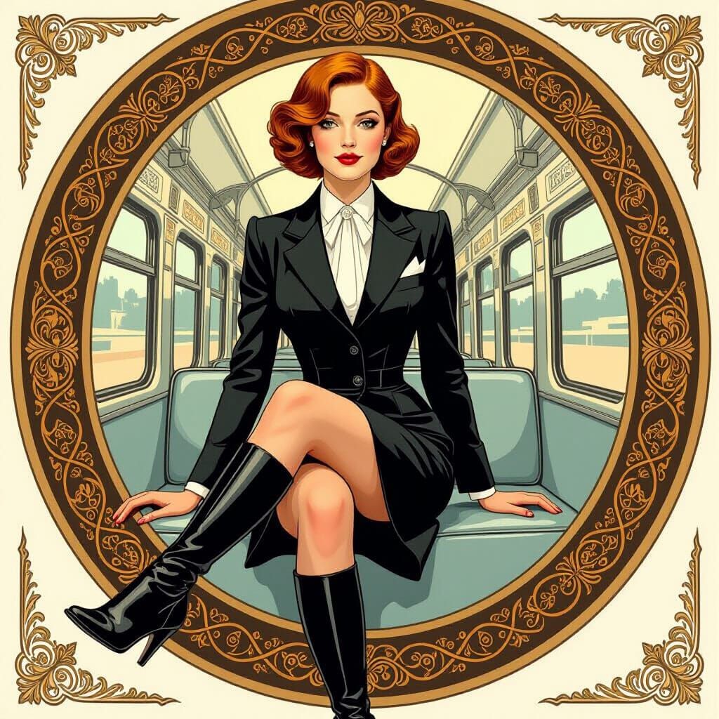 A striking picture of a young auburn-haired woman in a vintage train car. She wears a black skirt suit, white blouse, stockings and boots, designed with art nouveau patterns.
