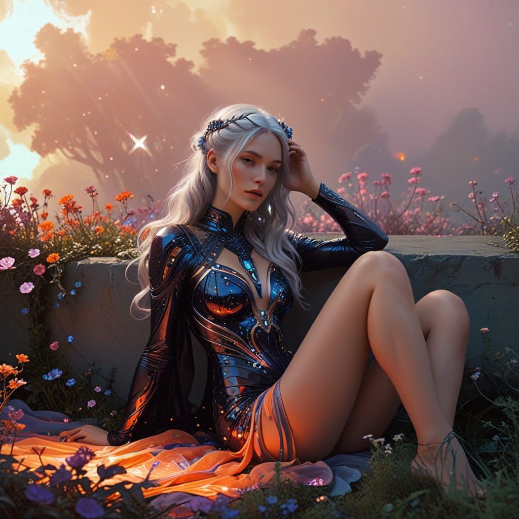A striking picture of a silver-haired woman in a stardust gown, standing in a bioluminescent garden. This digital painting blends art nouveau, tarot symbolism and cosmic fantasy with impasto and impressionistic techniques.