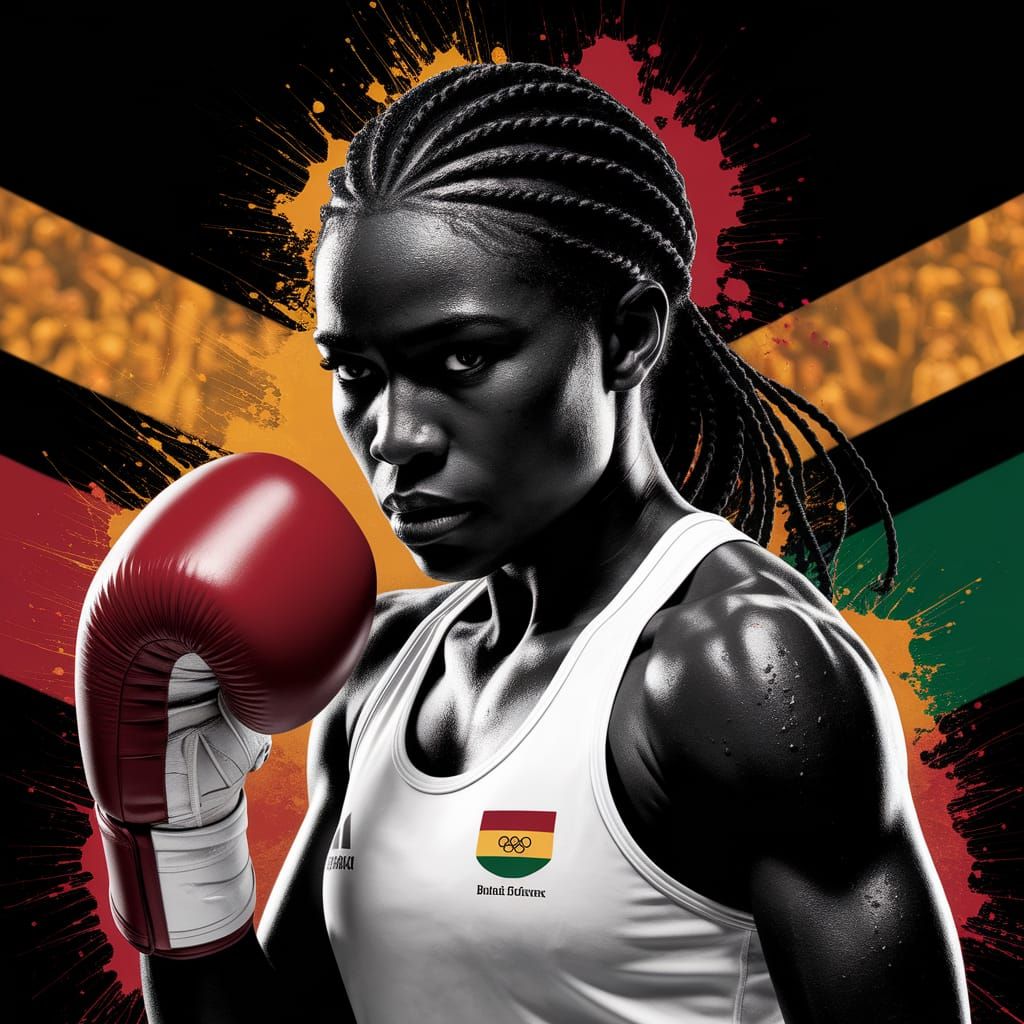 A striking photograph captures Black Wonder Woman as a powerful female boxer for Ghana at the Sydney Commonwealth Games. Dynamic lighting and vibrant warm colors emphasize her intense focus and the spirit of athletic competition.
