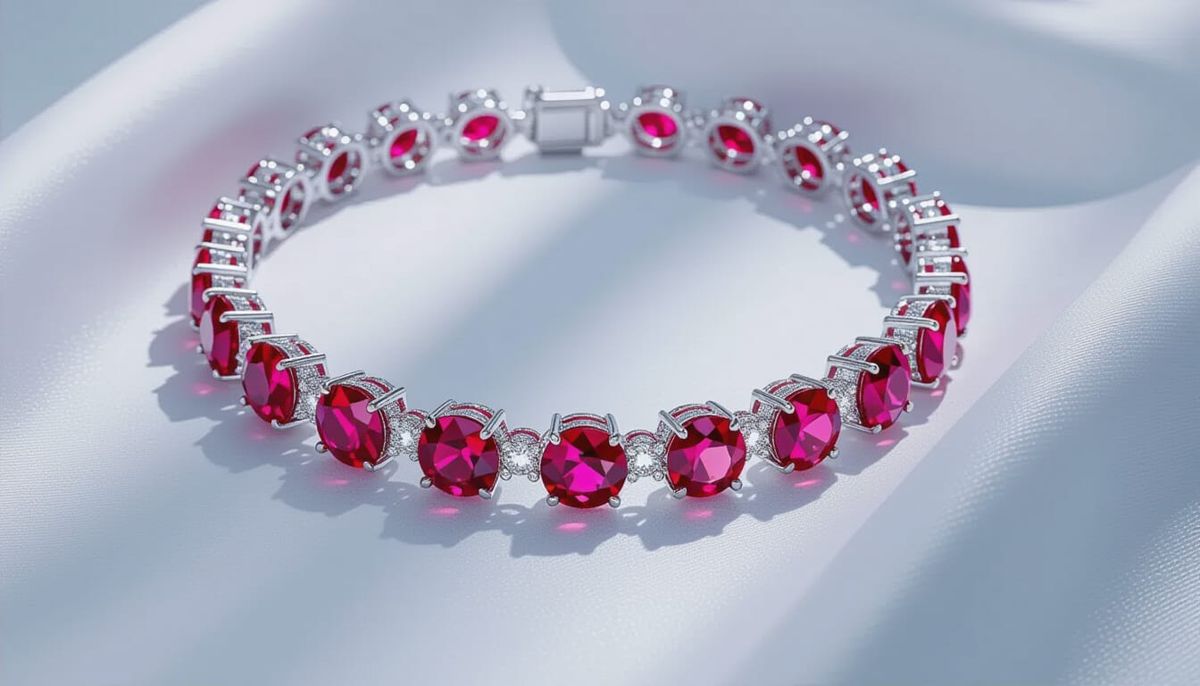 This image showcases a hyperrealistic 3D render of a luxurious ruby and diamond necklace. Soft studio lighting accentuates its intricate design and vibrant gemstones against a white velvet background.