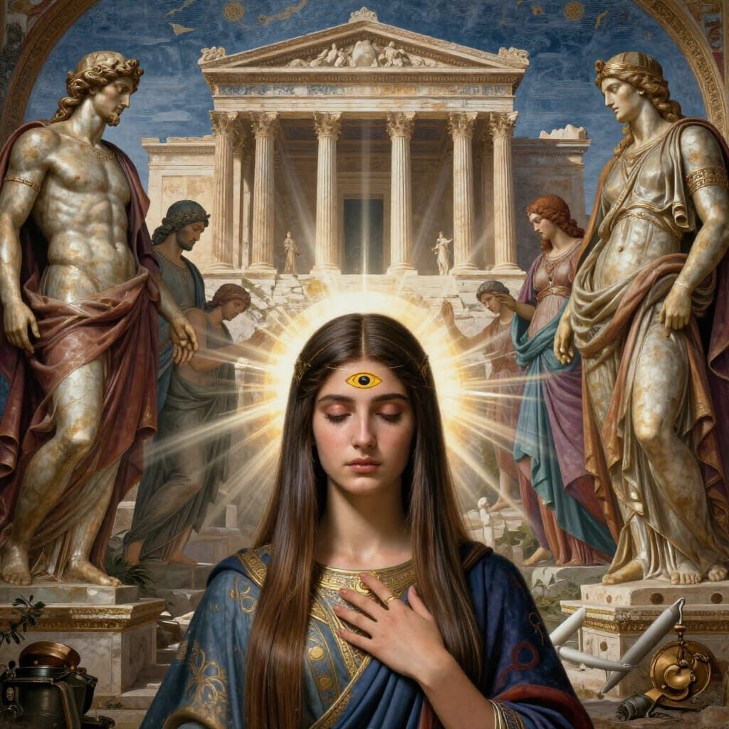michelangelo paintings style and colours : rhodes colossus guys around with central beautiful armenian woman with ultra straight hair, shy, very connected spiritual, Erechtheion in background with ruins, third eye chakra,, ray of lights between characters, ultra deep contrast, large scene composition, ...