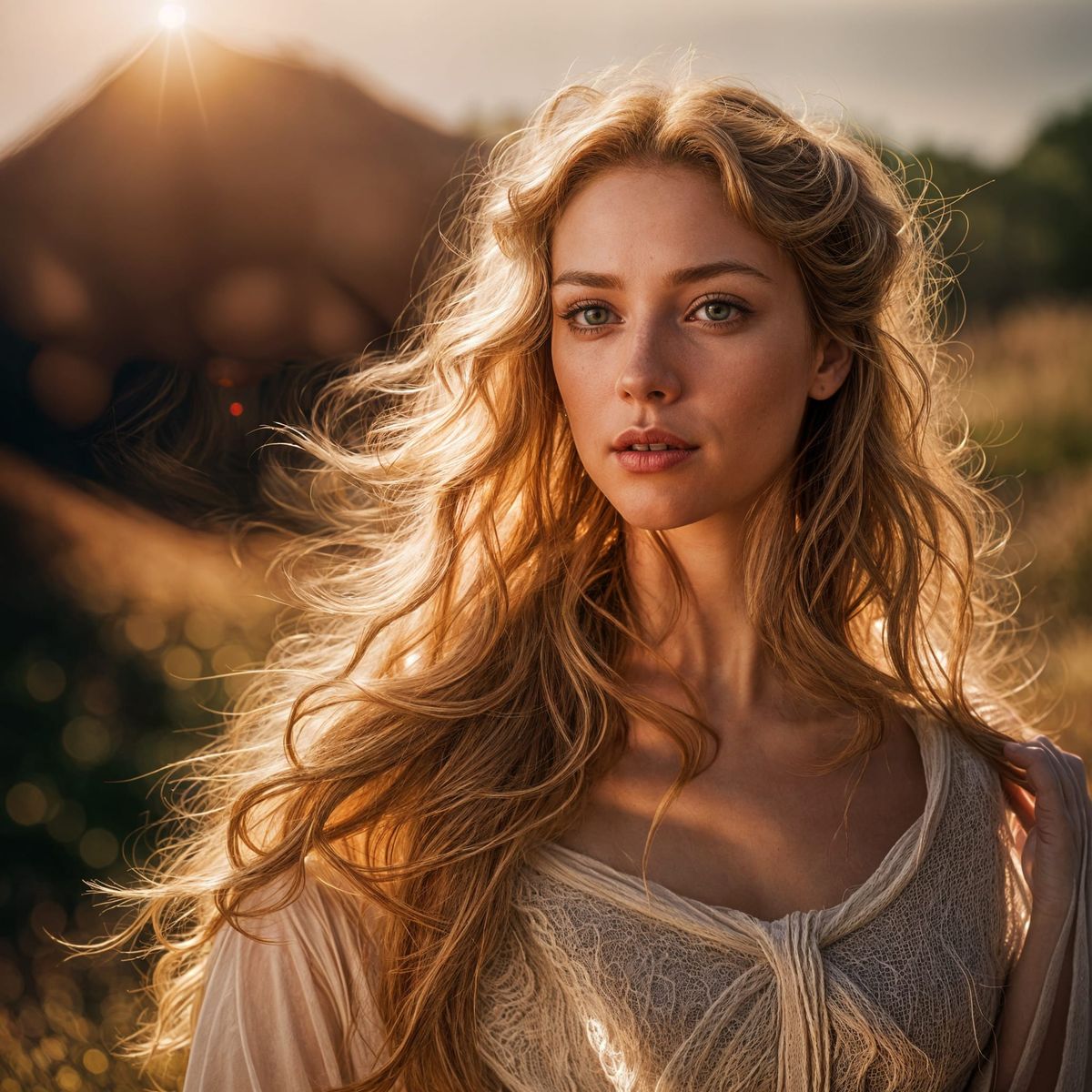 This image shows a beautiful woman with thick, sun-streaked reddish-blonde hair. She exudes a sensuous attitude, with a captivating desire reflected in her eyes.