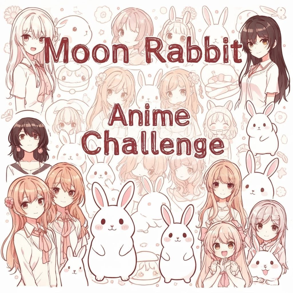 This image features adorable anime characters and rabbits surrounding the text 'Moon Rabbit Anime Challenge' on a whimsical background. Perfect for fans of cute anime art.