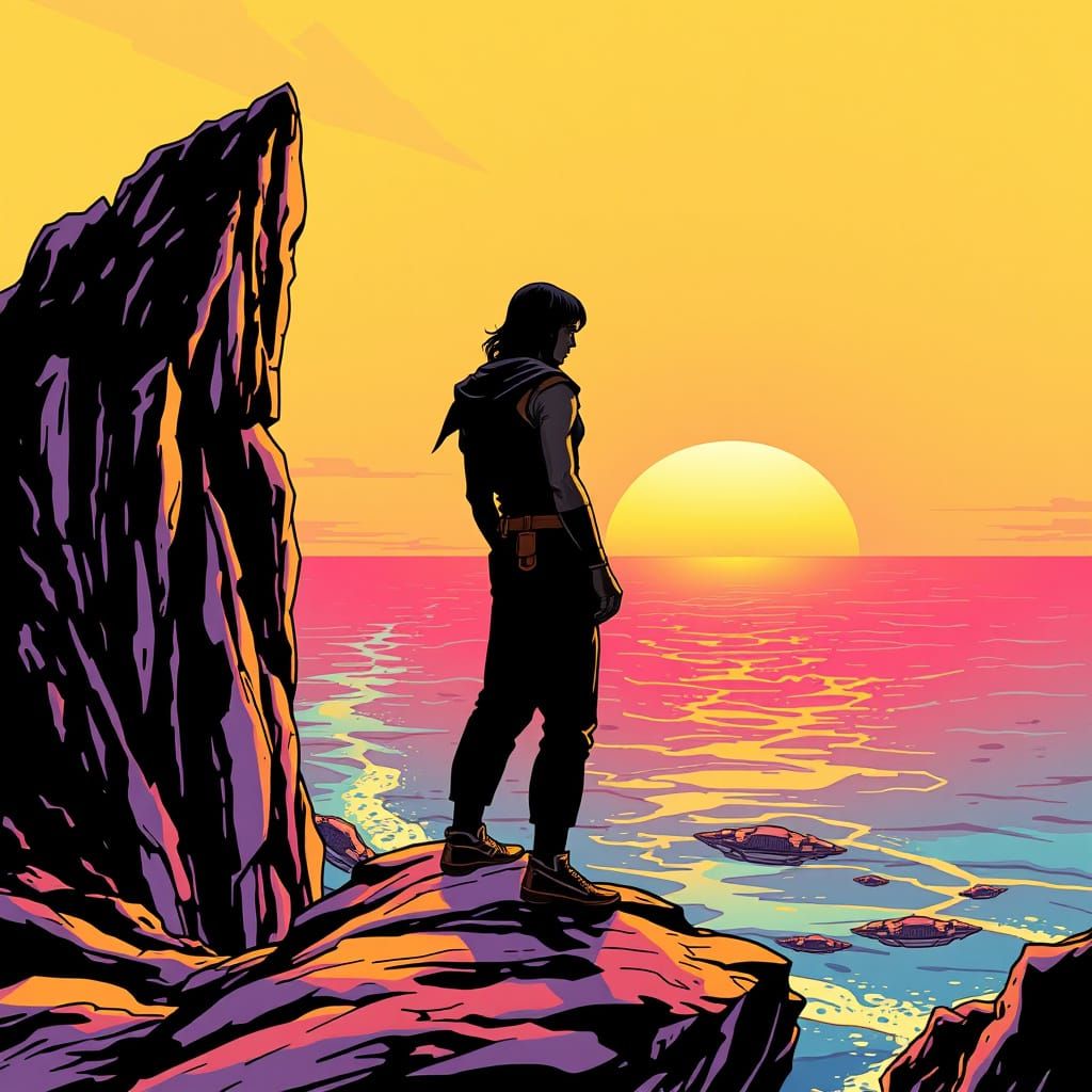 This image shows a dynamic comic book illustration of a lone figure standing on a cliffside, overlooking a vast alien ocean under a dramatic twin suns setting. Inspired by classic retro-futurism and vintage illustrations.
