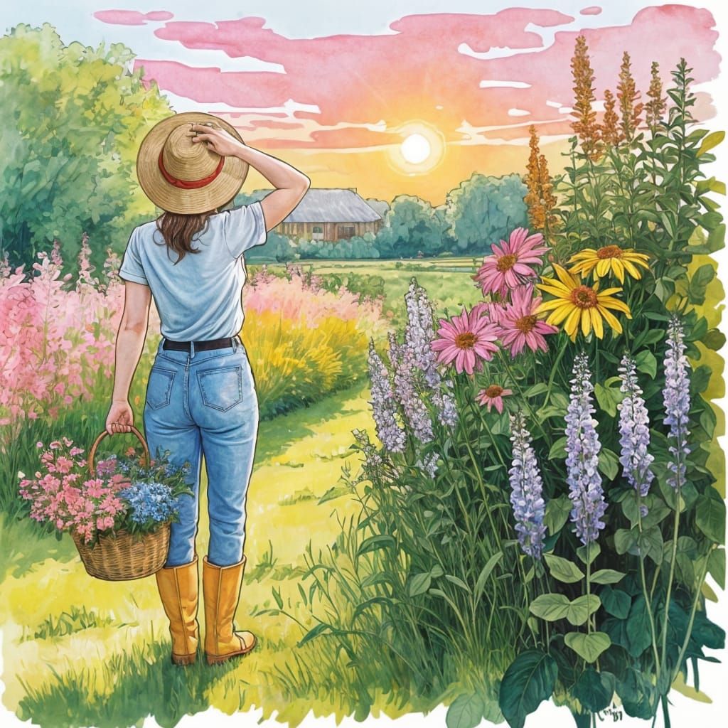 A hyperdetailed image shows a gardener resting after tending to summer flowers in a cottage garden at sunset. The scene captures a serene moment, rendered in delicate alcohol inks.