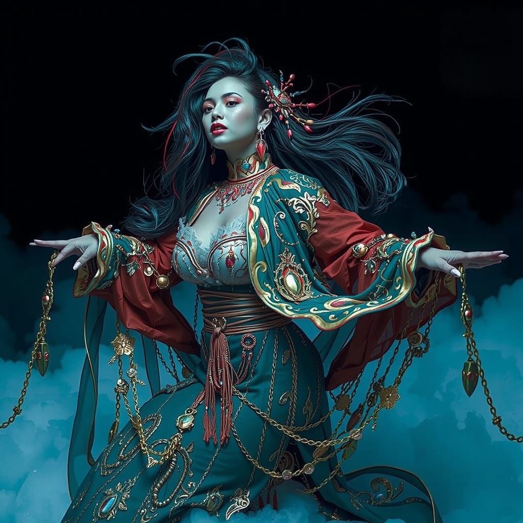 A striking picture of a flamboyant woman in lustrous attire, posing elegantly in a dramatic setting. The image is rendered in vivid, intense colors with detailed textures.