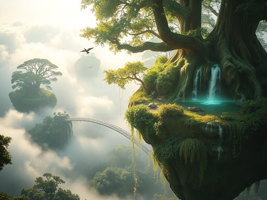A surreal, hyper-realistic fantasy landscape depicting a vast jungle floating in the sky, with giant trees and waterfalls cascading into clouds, illuminated by soft, diffused sunlight.