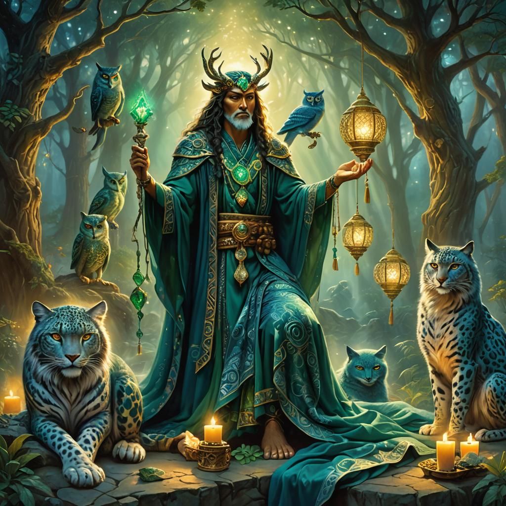 A dreamy fantasy scene featuring the Emerald Woken Shepard, the Three Tailed Shaman, and the Six-Armed Blue Owl Leopard King. Soft golden light creates a whimsical and ethereal atmosphere, as a hyperdetailed painting.