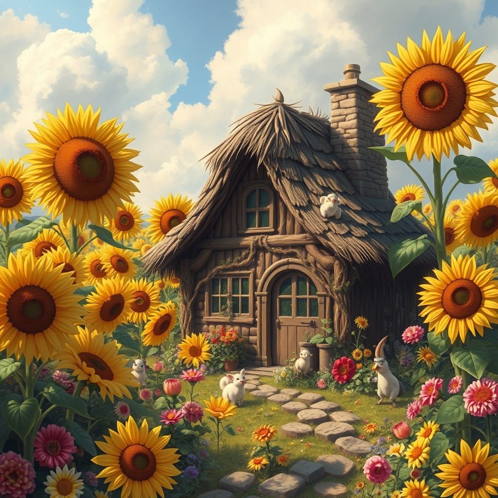Imagine a cozy cottage nestled in a valley of giant sunflowers. The cottage is built from woven vines and has a thatched roof made of sunflower petals. A whimsical garden surrounds the cottage, filled with oversized flowers and playful creatures. Capture this scene in a dreamy, painterly style, reminiscent ...