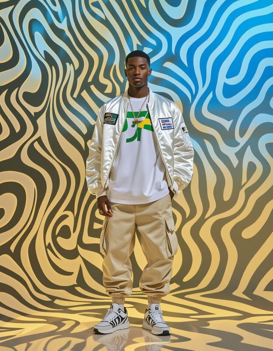 This image shows a realistic male avatar in a modern room. He wears a bomber jacket, graphic t-shirt, cargo pants, and designer sneakers, lit by soft studio lighting. The image has a cinematic and polished 3D art style.