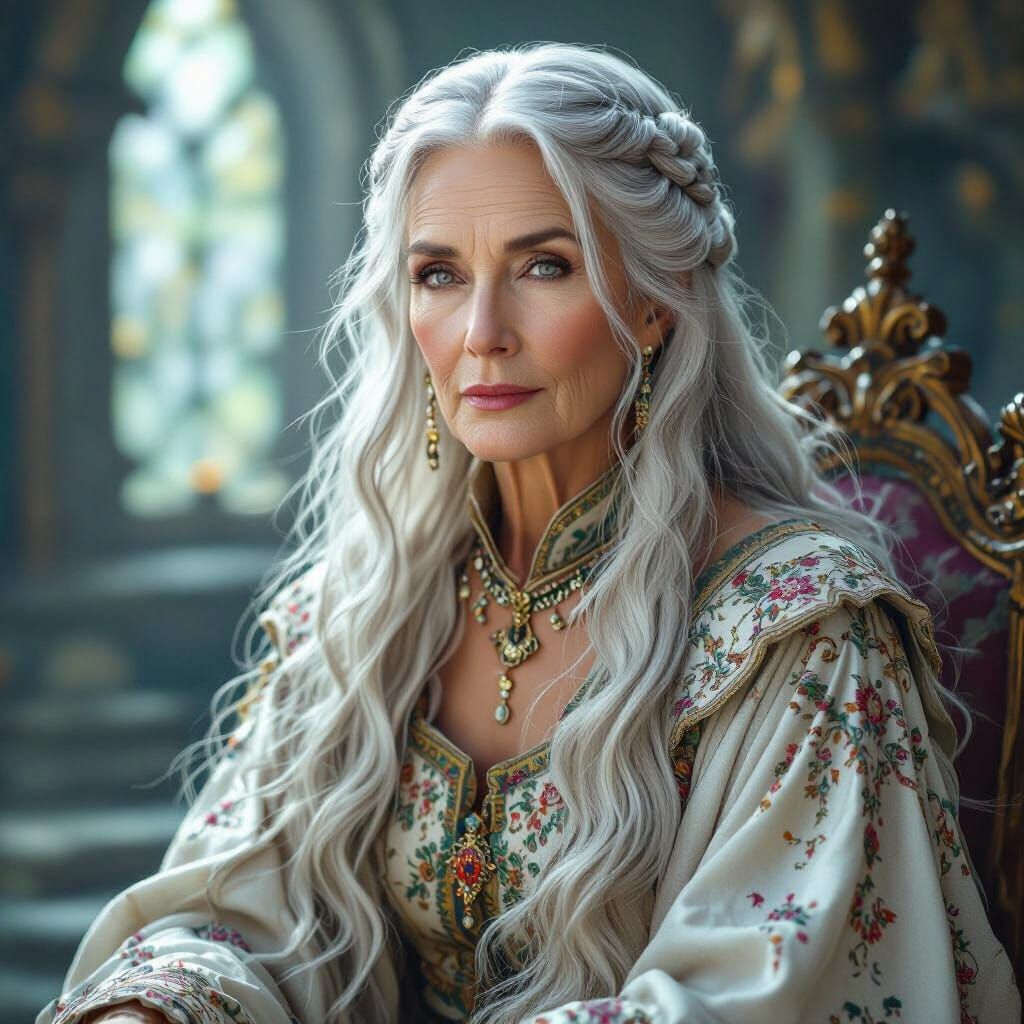This image shows an elderly woman with flowing silver hair in a medieval gown. The mystical environment is lit with cinematic lighting, rendered with photorealistic detail, and evokes a fantasy atmosphere.