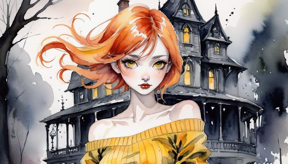 This inkpunk watercolor wash image shows a whimsical young girl with orange hair and red eyes performing a mischievous act in front of a spooky haunted house under a dark sky.