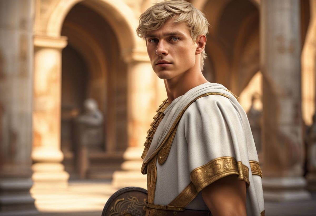 A hyperrealistic image shows a fair-haired young man in Roman clothing battling gladiators. Volumetric lighting and intricate details enhance the cinematic composition in a classic art nouveau style.