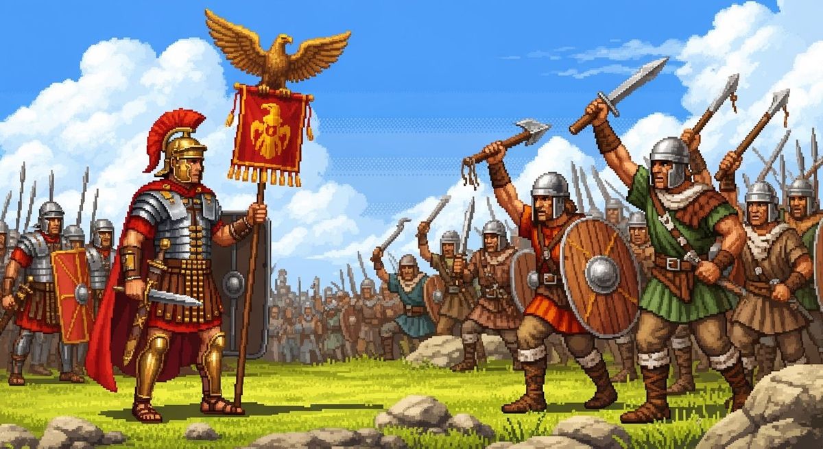 Retro 128-bit pixel art of a kind and cheerful Roman Legion facing off, across the grassy and rocky field of battle with a horde of ragged clothed warrior Picts carrying handmade weapons. The sky is unambiguous, bathed in the light of a clear, sunny day. The setting embodies the classic Play Station ...