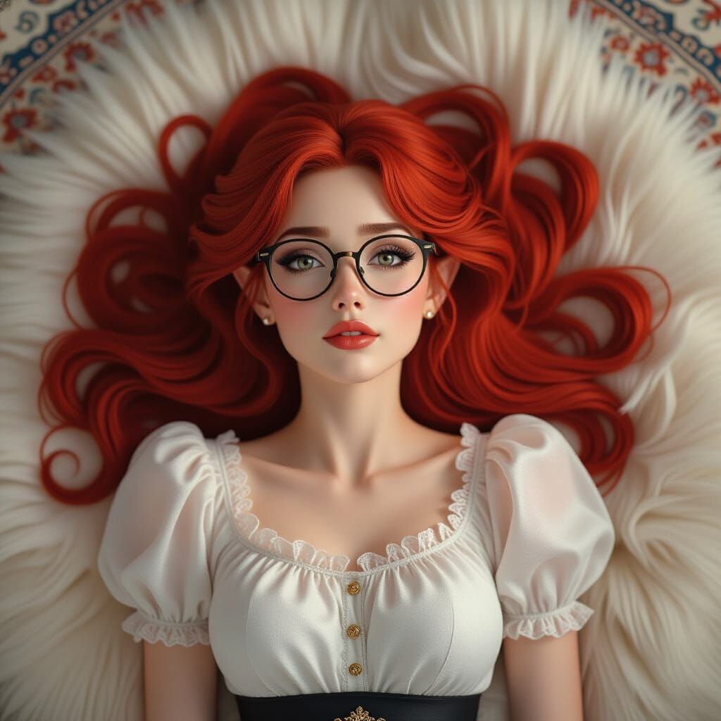 A top-down view of a grey-skinned elf woman with red hair lying on a fur rug. She wears glasses and a tulle blouse, with a worried expression. The image is rendered with sfumato techniques.