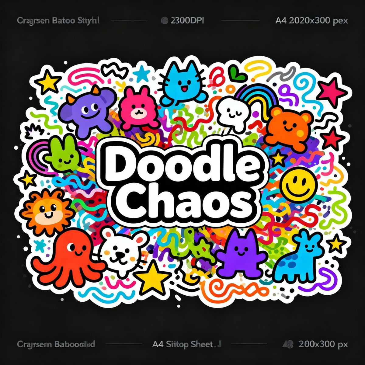 This image is a chaotic, colorful explosion of cute animals, squiggles, stars, and smiley faces, with "Doodle Chaos" prominently displayed. Rendered in a minimalist line art style with a sketchbook decal aesthetic.